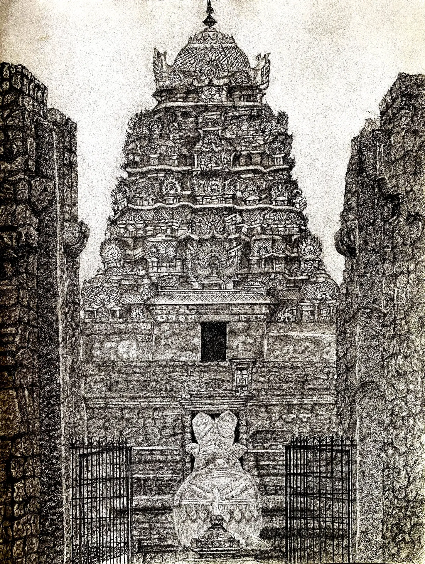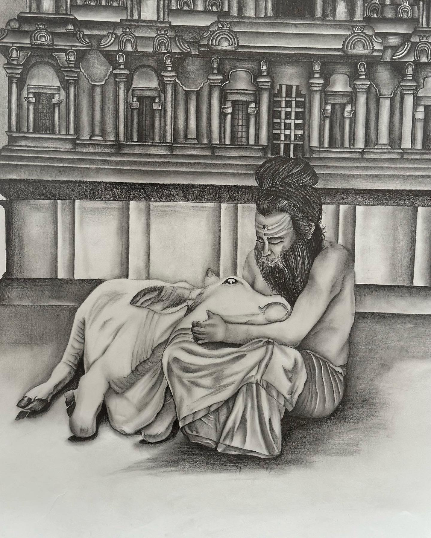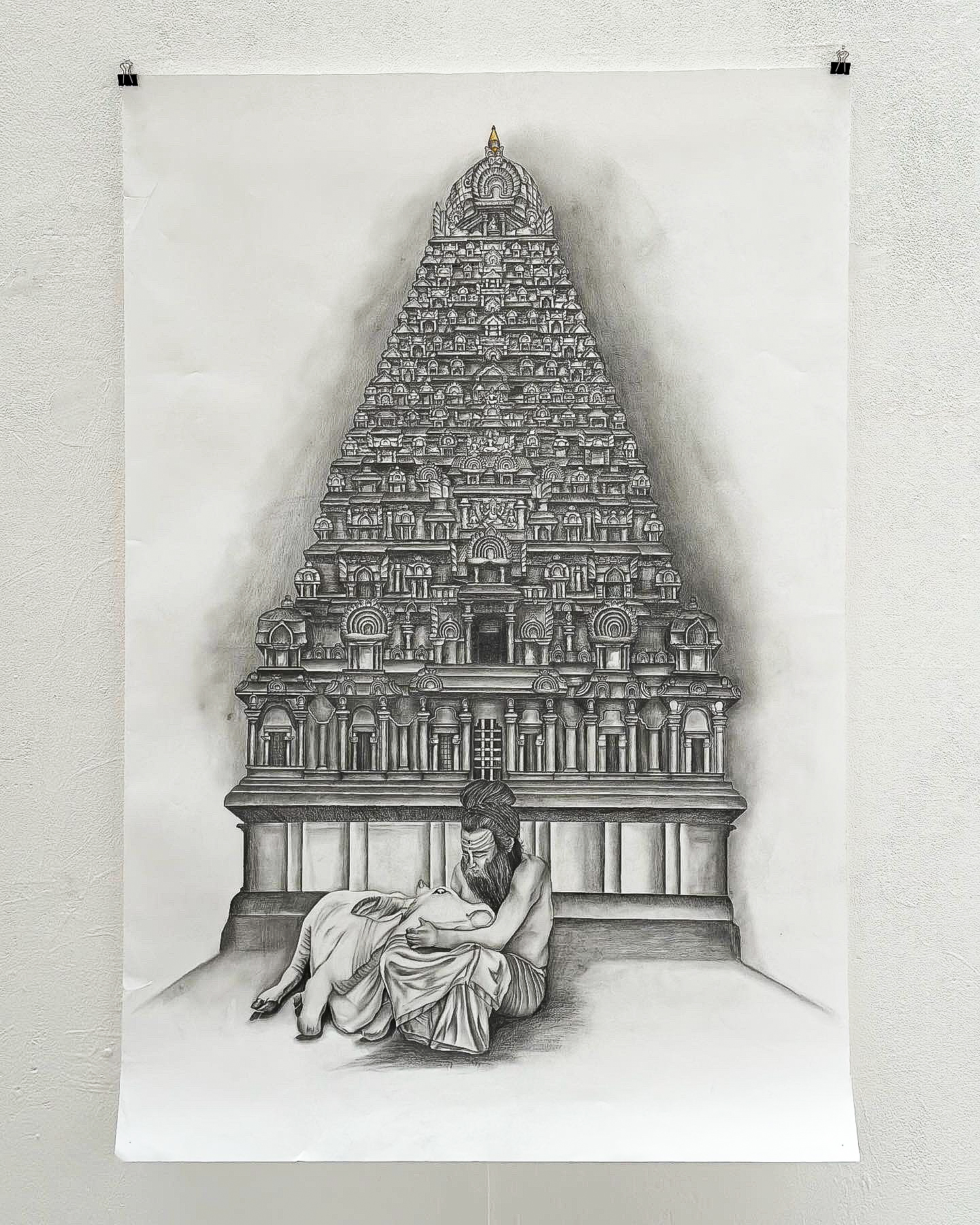 This graphite drawing blends sacred architecture with intimate emotion. A detailed South Indian temple tower rises majestically in the background, symbolising spiritual endurance and cultural memory. In stark contrast, a serene figure gently holds another in his lap, evoking care, grief, or quiet strength. The composition speaks to protection, humanity, and the search for solace within tradition. Delicate shading and a single gold accent at the temple’s peak draw the eye upward, offering a quiet moment of reflection and reverence.