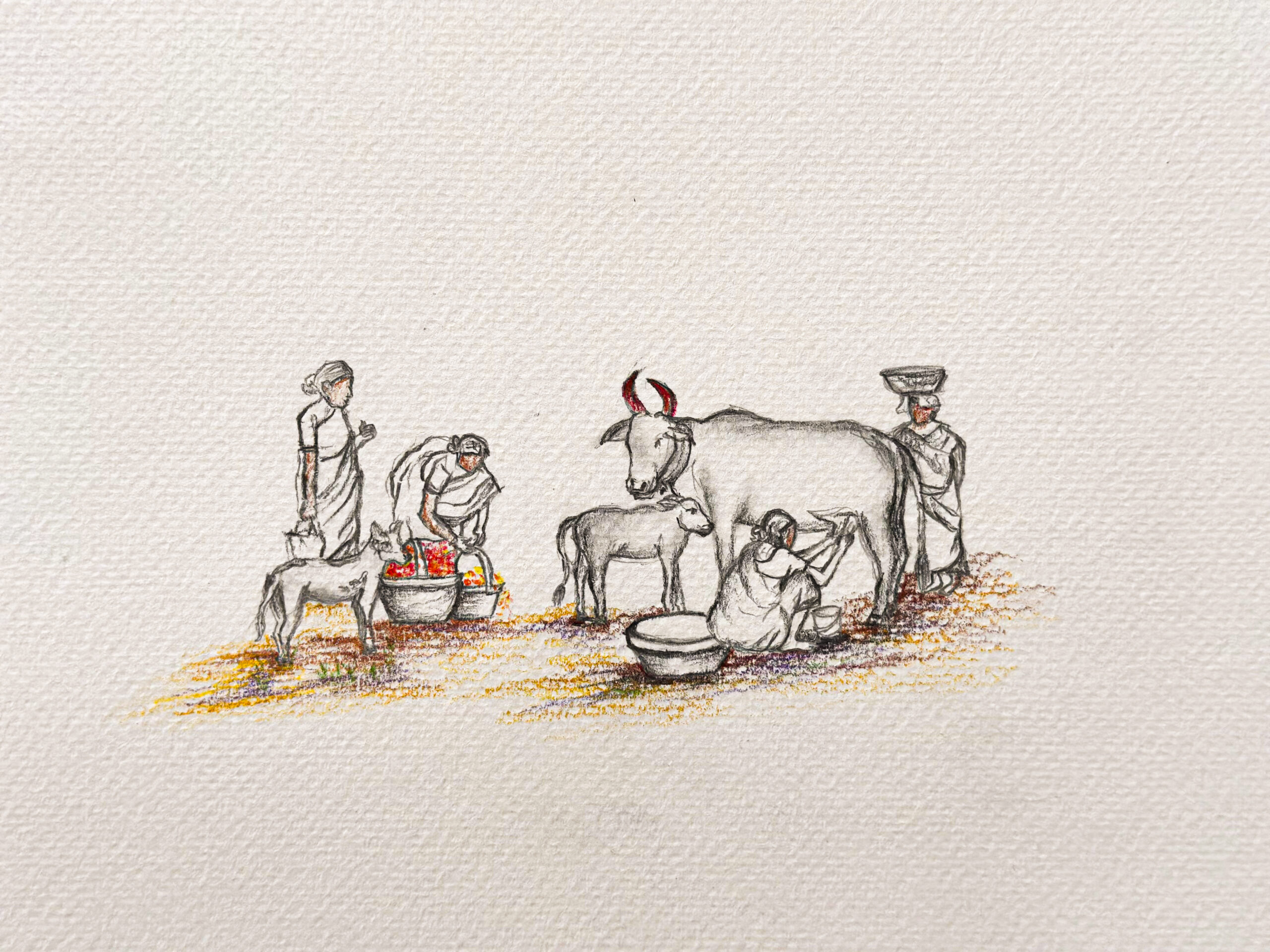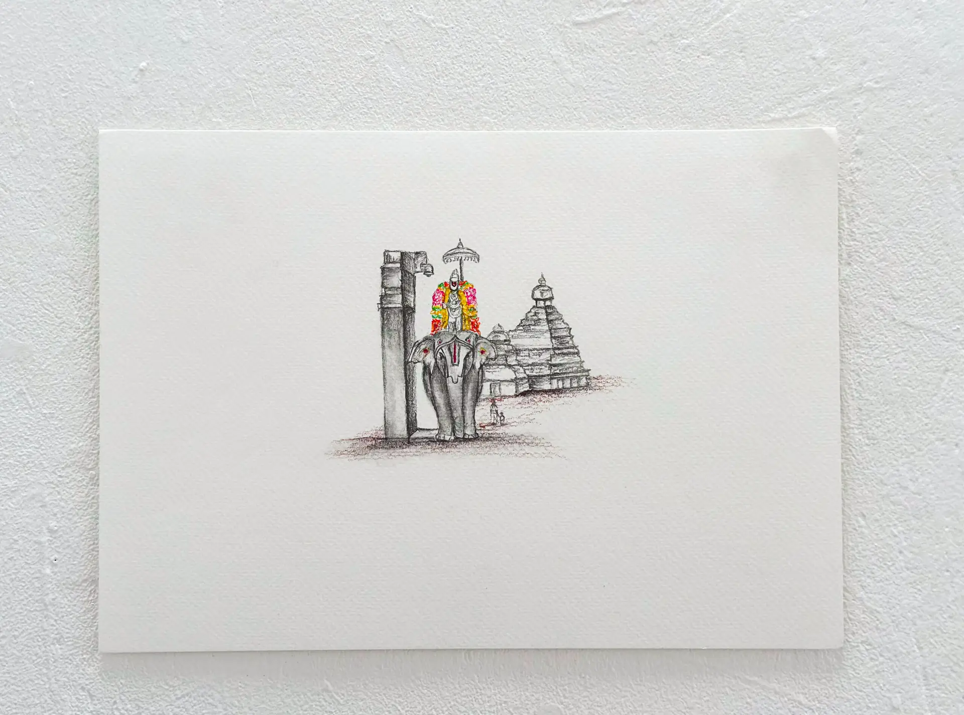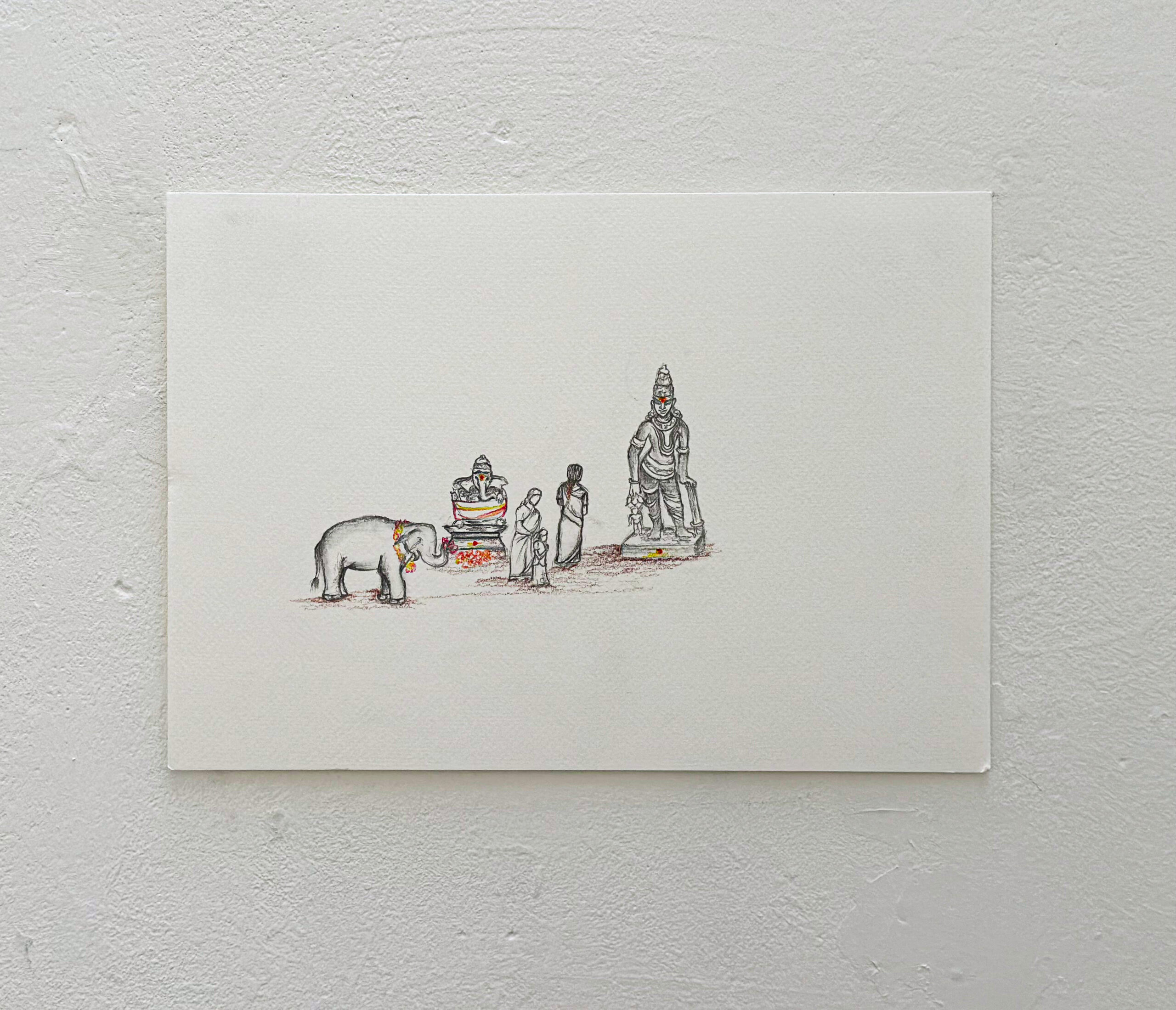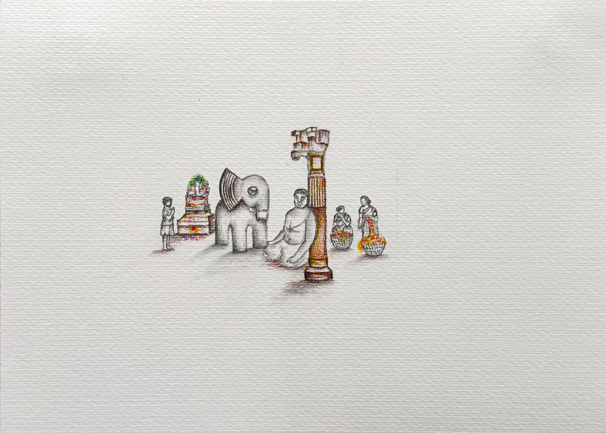 This graphite drawing blends sacred architecture with intimate emotion. A detailed South Indian temple tower rises majestically in the background, symbolising spiritual endurance and cultural memory. In stark contrast, a serene figure gently holds another in his lap, evoking care, grief, or quiet strength. The composition speaks to protection, humanity, and the search for solace within tradition. Delicate shading and a single gold accent at the temple’s peak draw the eye upward, offering a quiet moment of reflection and reverence.